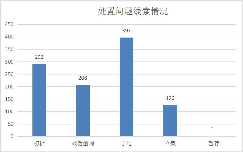 1-6月,共处置问题线索546件1024次,其中,初核292次,谈话函询208次,了结397次,立案126次,暂存1次。