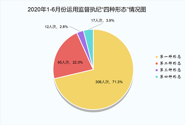 上半年,全县纪检监察机关用好用活用足“四种形态”处理432人次,其中第一种形态处理308人次,占比71.3%;第二种形态处理95人次,占比22.0%;第三种形态处理12人次,占比2.8 %;第四种形态处理17人次,占比3.9%。(宿州市纪委监委)