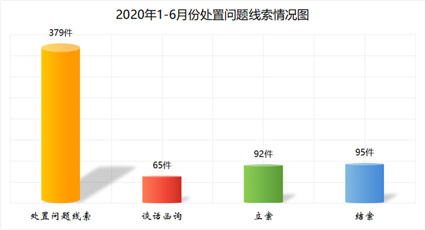 1-6月份,全县纪检监察机关共处置问题线索379件,其中采取谈话函询65件65人,立案92件117人,结案95件。