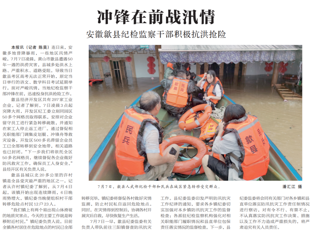 ●今天出版的中国纪检监察报头版报道了歙县遭遇50年一遇的洪涝灾害,当地纪检监察干部冲锋在前,迅速投身抗洪抢险工作的情况。除了组织受灾群众转移外,下一步,该县纪委监委将会同有关部门对各乡镇和县直单位落实防汛抗灾工作责任制情况进行察访。