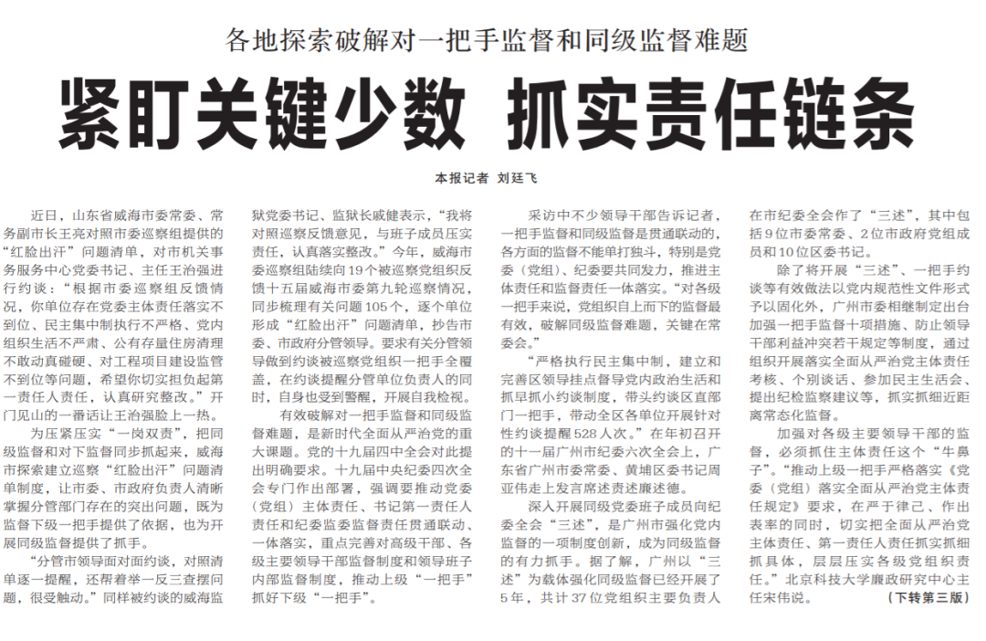 ●今天出版的中国纪检监察报头版头条以《紧盯关键少数 抓实责任链条》为题,报道了各地探索破解对一把手监督和同级监督难题的举措。文章指出,一把手监督和同级监督是贯通联动的,各方面的监督不能单打独斗。对各级一把手来说,党组织自上而下的监督最有效,破解同级监督难题,关键在常委会。