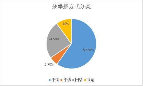 从信访举报方式上看:来信73件,来访7件,网络举报30件,来电12件。