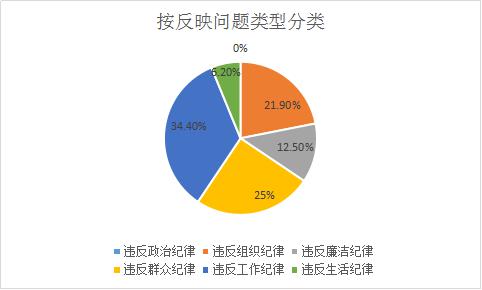 从反映问题类型上看:检举控告类违纪行为总量32件,其中反映违反政治纪律行为0件,违反组织纪律行为7件,违反廉洁纪律行为4件,违反群众纪律行为8件,违反工作纪律行为11件,违反生活纪律行为2件。