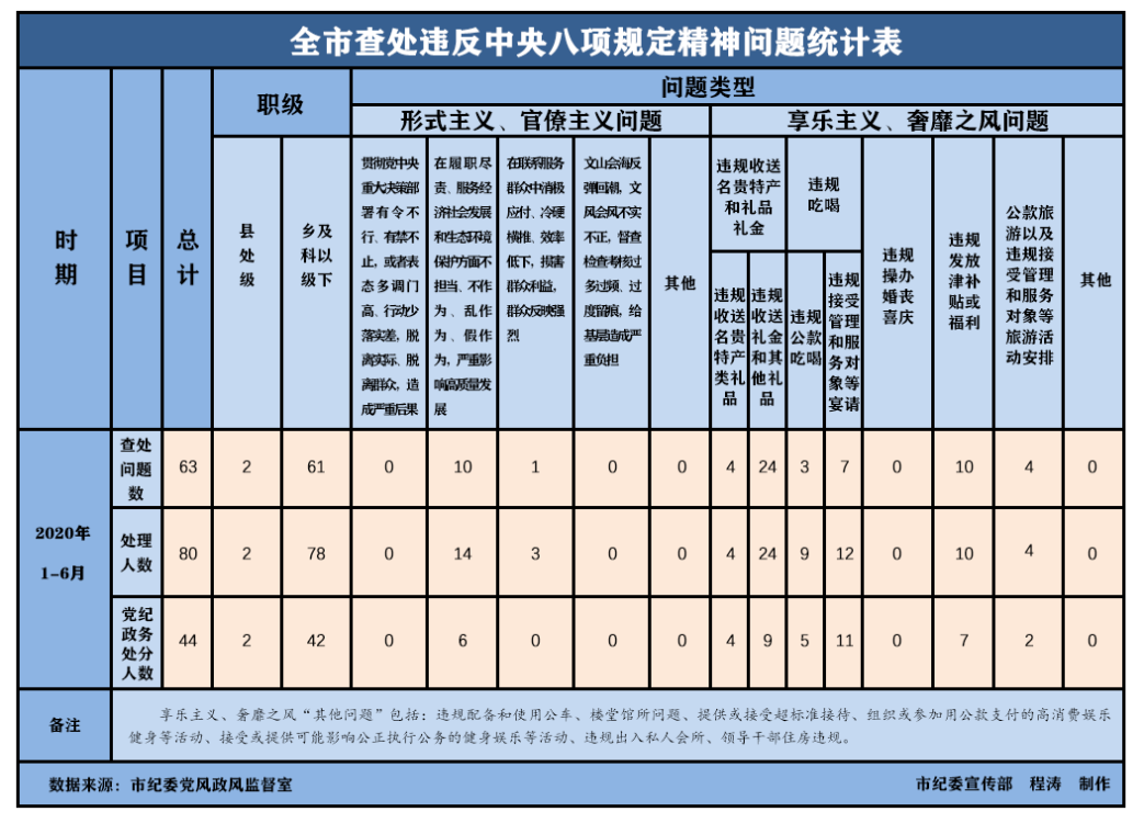 为巩固拓展落实中央八项规定精神成果,坚持不懈改进作风,铜陵市纪委监委在全市纪检监察机关建立了查处违反中央八项规定精神问题月报制度。2020年上半年,全市查处违反中央八项规定精神问题情况如下:
