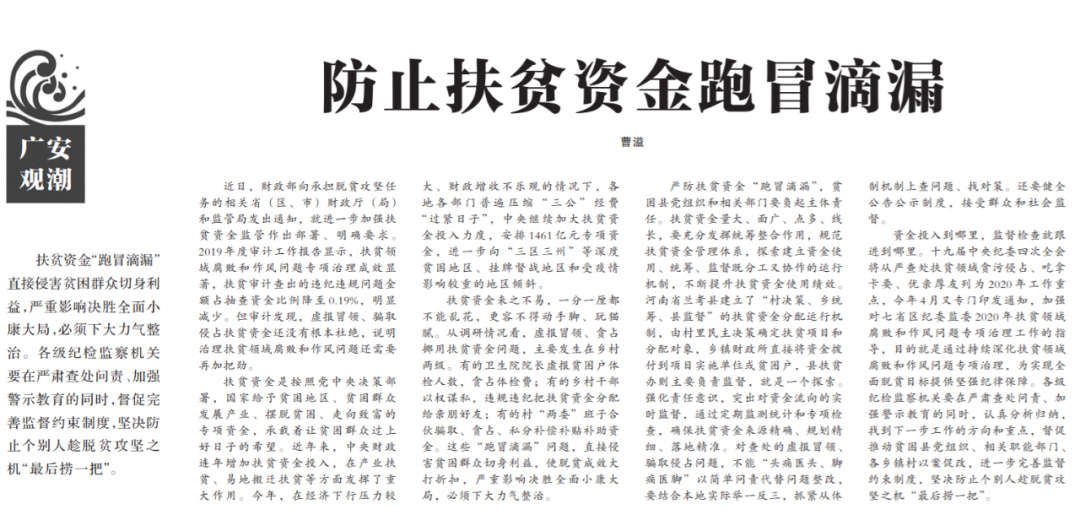 ●今天出版的中国纪检监察报广安观潮专栏发表评论《防止扶贫资金跑冒滴漏》指出,近日,财政部向承担脱贫攻坚任务的相关省(区、市)财政厅(局)和监管局发出通知,就进一步加强扶贫资金监管作出部署、明确要求。各级纪检监察机关要在严肃查处问责、加强警示教育的同时,认真分析归纳,找到下一步工作的方向和重点,督促推动贫困县党组织、相关职能部门、各乡镇村以案促改。