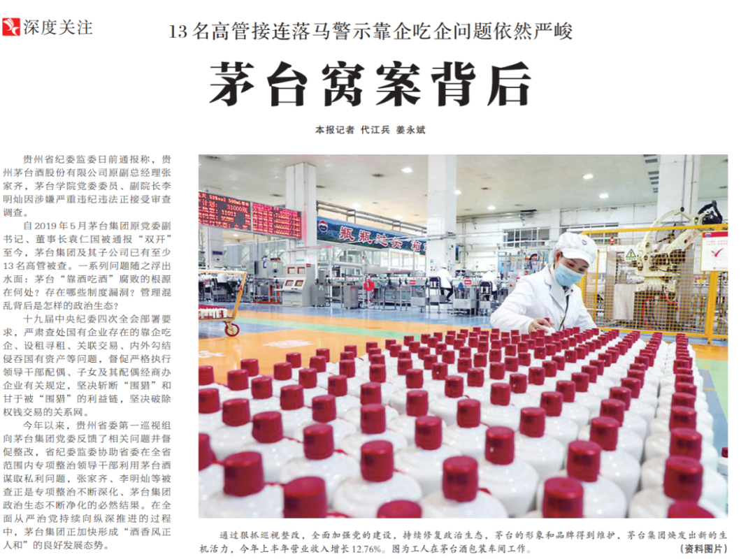●今天出版的中国纪检监察报深度关注专栏聚焦茅台集团系列腐败案件。文章指出,自2019年5月茅台集团原党委副书记、董事长袁仁国被通报“双开”至今,茅台集团及其子公司已有至少13名高管被查。窝案背后凸显的是以酒谋私利益链长期存在、企业管理混乱、党的领导严重缺失等乱象。国企要健康发展,党组织在把方向、管大局、抓队伍上不能缺位。贵州对茅台集中整治使茅台的形象和品牌得到了维护。