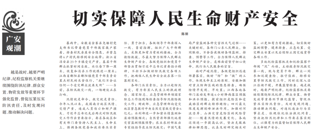 ●今天出版的中国纪检监察报广安观潮专栏发表评论《切实保障人民生命财产安全》。文章以安徽省金寨县尧塘村党支部书记冒着暴雨带着党员干部排查村民房屋安全隐患,转移村民等为例指出,各部门压实责任,全力以赴防汛救灾,有力彰显人民至上的执政理念。纪检监察机关要继续围绕防汛纪律、群众安置、物资发放等重要环节强化监督,督促压紧压实防汛责任。