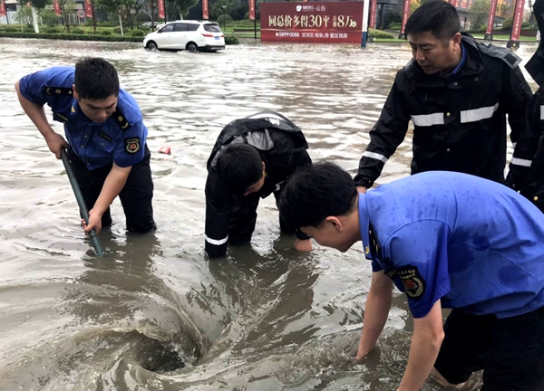 应急抢险队在城区主干道排涝