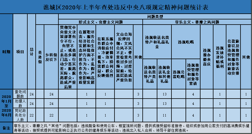 2020年上半年,谯城区纪检监察机关共查处违反中央八项规定精神问题24起,处理24人,其中给予党纪政务处分22人。其中,查处形式主义、官僚主义问题5起;查处享乐主义、奢靡之风问题19起。