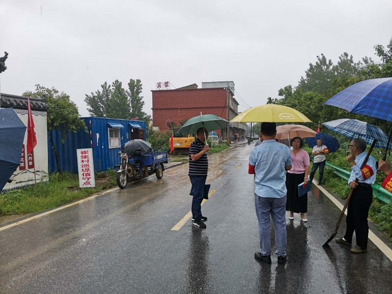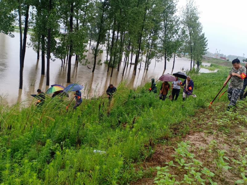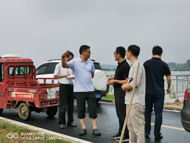 阜南县王家坝镇纪检干部积极投身巡堤现场,同村干部在崔集堤段查看堤坝情况。