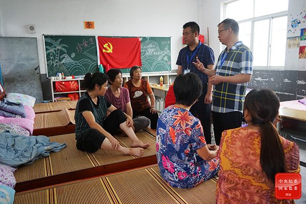 7月18日上午,安徽省青阳县纪检监察干部在丁桥镇中心小学安置点向群众了解安置生活保障情况。姜永斌 摄