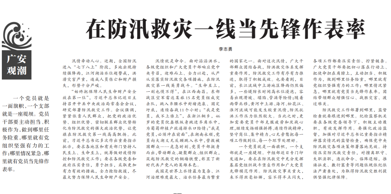 ●今天出版的中国纪检监察报广安观潮专栏发表评论《在防汛救灾一线当先锋作表率》。文章指出,防汛救灾中广大党员干部要主动担当、积极作为,做到哪里任务险重,哪里就有党组织坚强有力的工作;哪里情况紧急,哪里就有党员当先锋作表率。纪检监察机关要强化政治监督,持续压实防汛救灾责任,对擅离职守、失职渎职,违抗命令、临阵退缩,推诿扯皮、敷衍塞责等问题依规依纪依法严肃查处,为取得防汛救灾胜利提供坚强纪律保障。