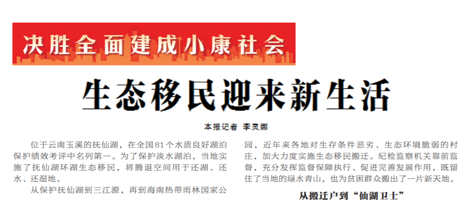 ●今天出版的中国纪检监察报头版以《生态移民迎来新生活》为题,报道了近年来各地对生存条件恶劣、生态环境脆弱的村庄,加大力度实施生态移民搬迁,各地纪检监察机关靠前监督,既保护当地生态环境,又维护贫困群众合法利益的相关举措。