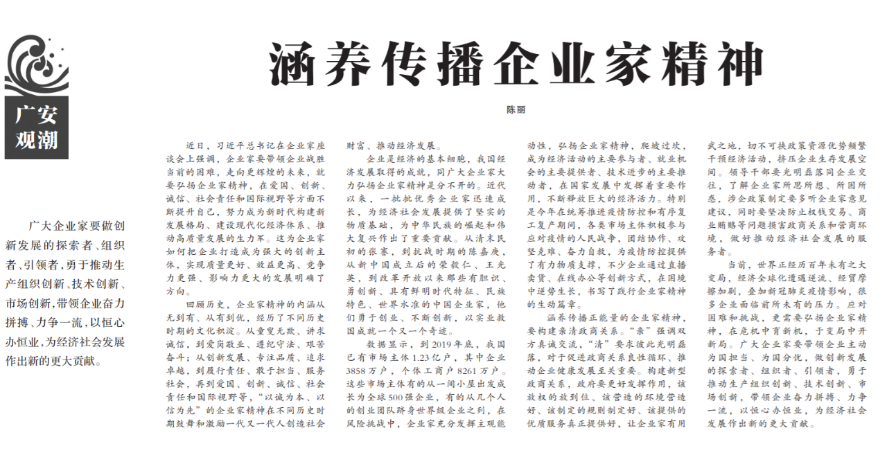 ●今天出版的中国纪检监察报广安观潮专栏发表评论《涵养传播企业家精神》。文章指出:涵养传播正能量的企业家精神,要构建亲清政商关系。政府要更好发挥作用,领导干部要光明磊落同企业交往。广大企业家要带领企业主动为国担当、为国分忧,做创新发展的探索者、组织者、引领者。