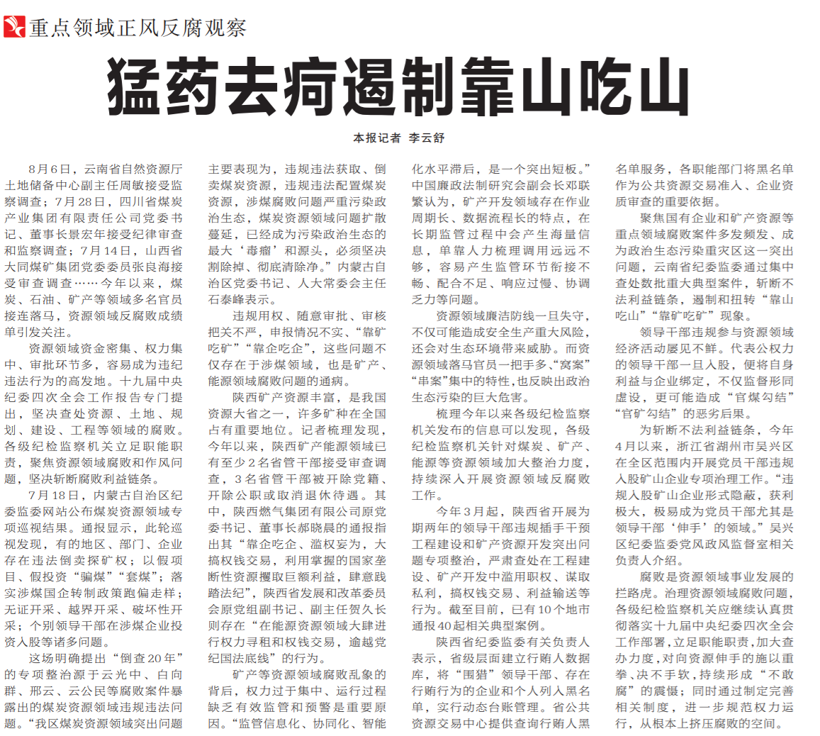 ●今天出版的中国纪检监察报头版头条发布重点领域正风反腐观察系列报道《猛药去疴遏制靠山吃山》。报道指出:资源领域资金密集、权力集中、审批环节多,容易成为违纪违法行为的高发地。腐败乱象的背后,权力过于集中、运行过程缺乏有效监管和预警是重要原因。各级纪检监察机关应继续加大查办力度,持续形成“不敢腐”的震慑;同时通过制定完善相关制度,进一步规范权力运行,从根本上挤压腐败的空间。