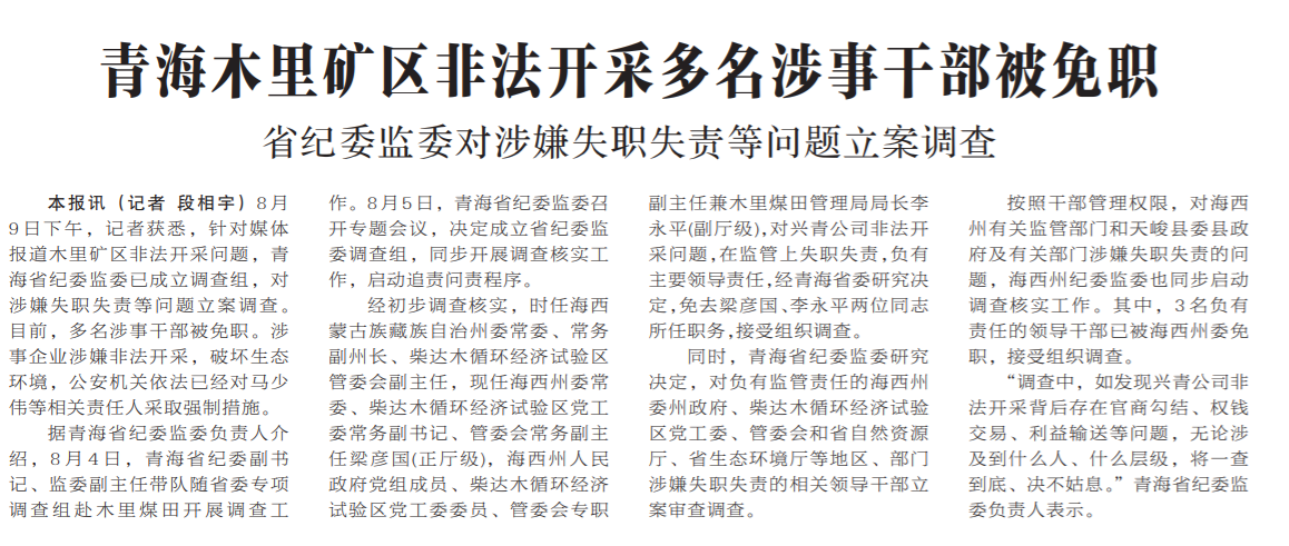 ●8月9日,记者获悉,针对媒体报道木里矿区非法开采问题,青海省纪委监委已成立调查组,对涉嫌失职失责等问题立案调查。目前,海西州委常委梁彦国等多名涉事干部被免职。涉事企业涉嫌非法开采,破坏生态环境,公安机关依法已经对相关责任人采取强制措施。此前,有媒体报道称,一家名为青海省兴青工贸工程集团有限公司的企业,打着生态修复治理的名义,在祁连山南麓腹地木里矿区进行掠夺式采挖,获利上百亿元人民币。