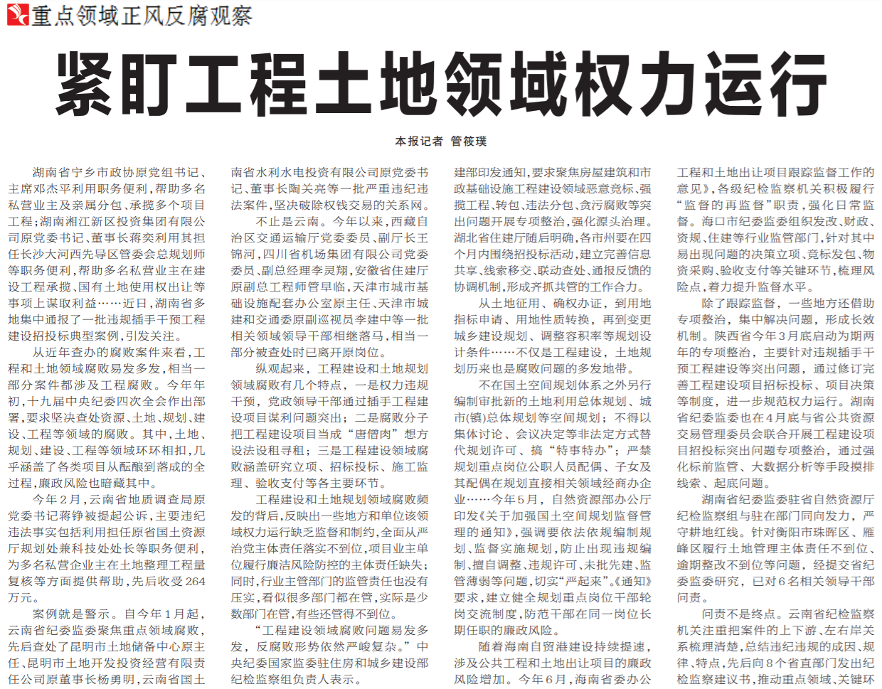 ●今天出版的中国纪检监察报头版头条刊发重点领域正风反腐观察系列报道《紧盯工程土地领域权力运行》。文章指出:工程建设和土地规划领域腐败具有权力违规干预问题突出等特点,反映出一些地方和单位该领域权力运行缺乏监督和制约,全面从严治党主体责任落实不到位,项目业主单位履行廉洁风险防控的主体责任缺失;同时,行业主管部门的监管责任也没有压实,看似很多部门都在管,实际是少数部门在管,有些还管得不到位。