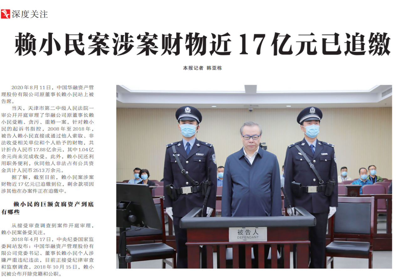●今天出版的中国纪检监察报深度关注专栏报道了纪检监察机关对赖小民案涉案财物的追缴情况。截至目前,赖小民案涉案财物近17亿元已追缴到位,剩余款项因涉其他在办案件正在追缴中。赖小民案暴露了金融领域的制度和监管漏洞,警示必须加强监督,特别是要加强对国有金融企业“一把手”的监督。