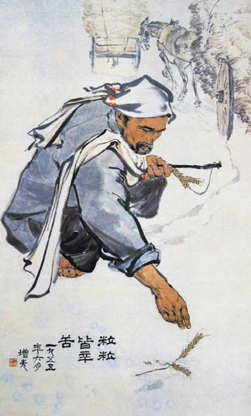 唐朝初期统治者节俭务实,创业兴邦,而唐朝中后期奢靡之风又盛。讴歌节俭、劝诫奢侈于是成为唐诗的一个重要内容。李绅将“盘中餐”的粮食与农民在烈日之下的汗水联系在一起,凝成了“粒粒皆辛苦”的名句;杜甫《往在》里说:“君臣节俭足,朝野欢呼同。中兴似国初,继体如太宗。”白居易则写道:“岁丰仍节俭,时泰更销兵。圣念长如此,何忧不太平。”提出太平之世的“秘诀”在于节俭销兵,即使是在丰收之年,也不能丢弃勤俭之德。