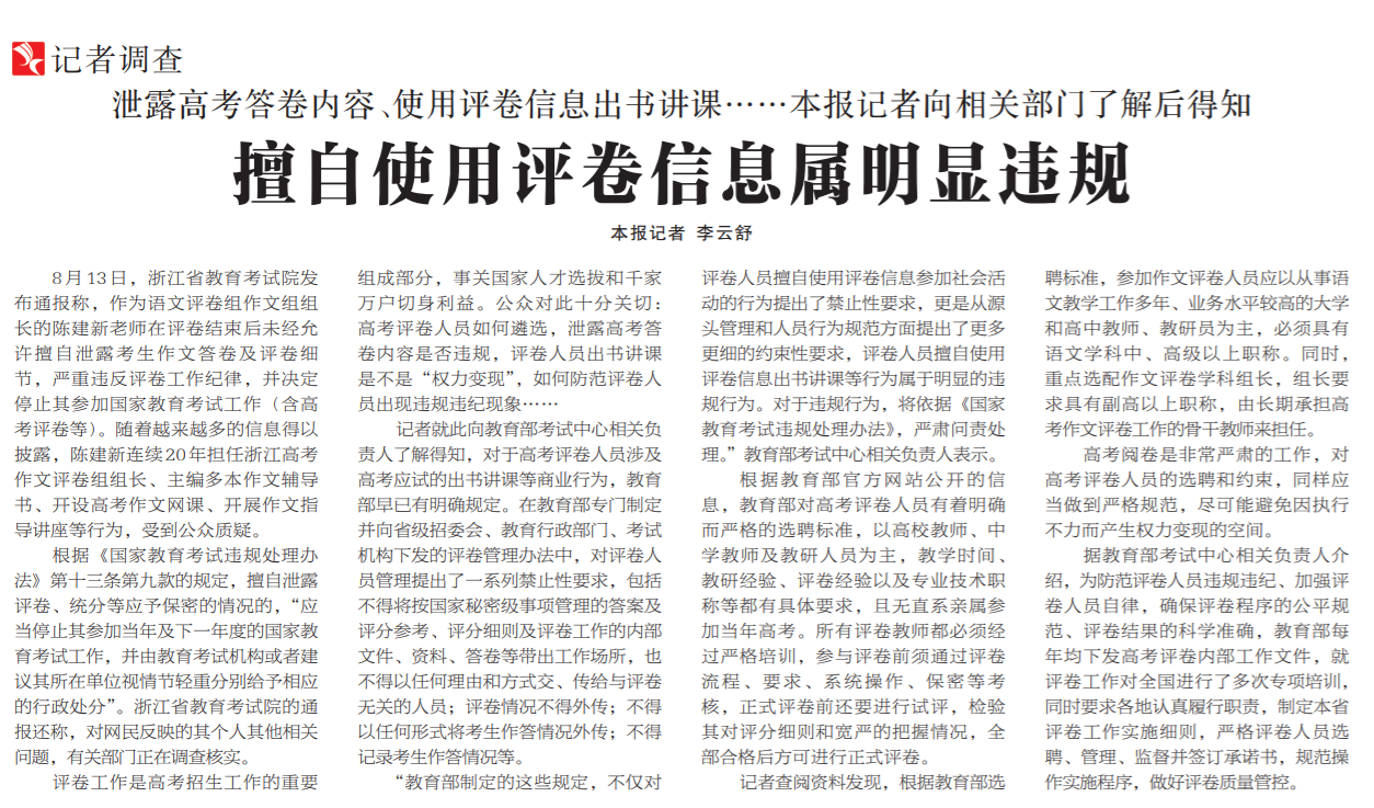 ●针对浙江高考语文评卷组作文组组长陈建新因擅自泄露考生作文答卷及评卷细节,被停止参加国家教育考试工作一事,今天出版的中国纪检监察报头版发布记者调查指出:擅自使用评卷信息属明显违规行为,要依据《国家教育考试违规处理办法》严肃问责处理。高考阅卷是非常严肃的工作,对高考评卷人员的选聘和约束,同样应当做到严格规范,尽可能避免因执行不力而产生权力变现的空间。