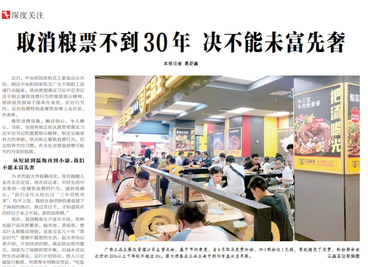 ●今天出版的中国纪检监察报深度关注专栏发表报道《取消粮票不到30年 决不能未富先奢》指出,当前全国各地正在制定实施更有力的举措,坚决制止餐饮浪费行为,切实培养节约习惯,在全社会营造浪费可耻节约为荣的氛围。截至目前,全国至少有27个省份的商务厅、省级餐饮饭店协会或消费者协会发出倡议书,倡议企业及消费者杜绝餐饮浪费行为,培养节约习惯。