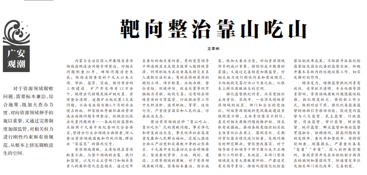 ●今天出版的中国纪检监察报广安观潮专栏发表评论《靶向整治靠山吃山》,以内蒙古自治区深入开展煤炭资源领域违规违法问题专项整治为例指出:对于资源领域腐败问题,需要标本兼治,综合施策,既加大查办力度,对向资源领域伸手的施以重拳,持续形成不敢腐的震慑;又通过完善制度加强监管,对相关权力进行刚性约束和有效规范。