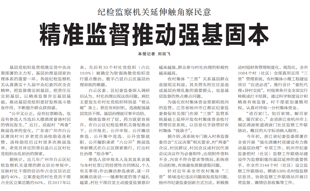 ●今天出版的中国纪检监察报头版头条以《精准监督推动强基固本》为题,报道了各级纪检监察机关把监督落实到基层,把责任压实到基层,以精准监督夯实基层基础,推动基层党组织更好发挥战斗堡垒作用的举措。
