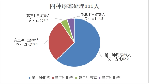 上半年,区纪委监委运用监督执纪“四种形态”处理111人次。其中,第一种形态69人次,占62.2%;第二种形态32人次,占28.8%;第三种形态5人次,占4.5%;第四种形态5人次,占4.5%。