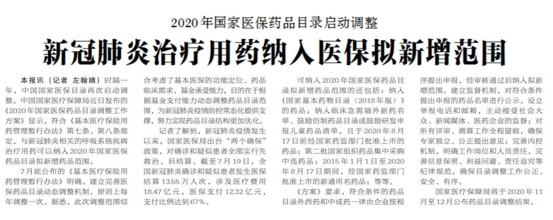 ●中国国家医疗保障局近日发布的《2020年国家医保药品目录调整工作方案》显示,符合《基本医疗保险用药管理暂行办法》第七条、第八条规定,与新冠肺炎相关的呼吸系统疾病治疗用药可以纳入2020年国家医保药品目录拟新增药品范围。