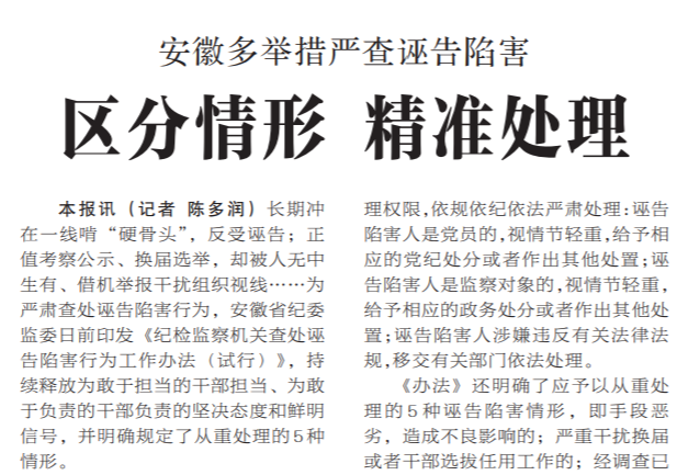 ●今天出版的中国纪检监察报以《区分情形 精准处理》为题,报道了安徽多举措严查诬告陷害的情况。安徽省纪委监委日前印发《纪检监察机关查处诬告陷害行为工作办法(试行)》,持续释放为敢于担当的干部担当、为敢于负责的干部负责的坚决态度和鲜明信号,并明确规定了从重处理的5种情形。