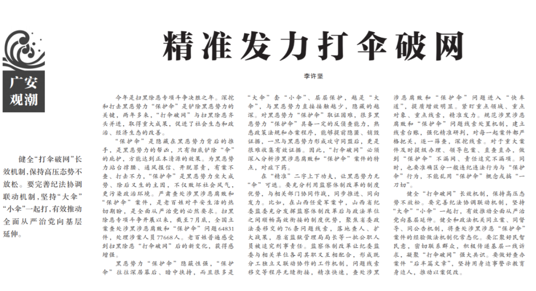 ●今天出版的中国纪检监察报广安观潮专栏发表评论《精准发力打伞破网》指出:要完善纪法协调联动机制,坚持“大伞”“小伞”一起打,有效推动全面从严治党向基层延伸。健全和政法机关同立案、同督导、同公告机制,将查处涉黑涉恶“保护伞”案件的经验做法机制化常态化。