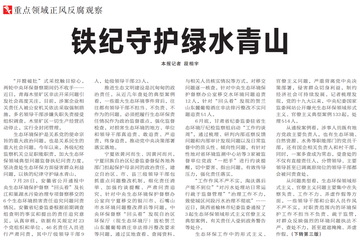 ●今天出版的中国纪检监察报头版头条发布重点领域正风反腐观察系列报道《铁纪守护绿水青山》。文章指出:推进生态文明建设是沉甸甸的政治责任。从近几年查处的典型案例看,一些重大生态环境事件背后,往往都有领导干部不担当、不负责、不作为的问题。必须把履行生态环保责任情况作为政治监督重点,强化监督检查,对损害生态环境的地方、单位和领导干部真追责、敢追责、严追责,终身追责,推动党中央决策部署落实落地。