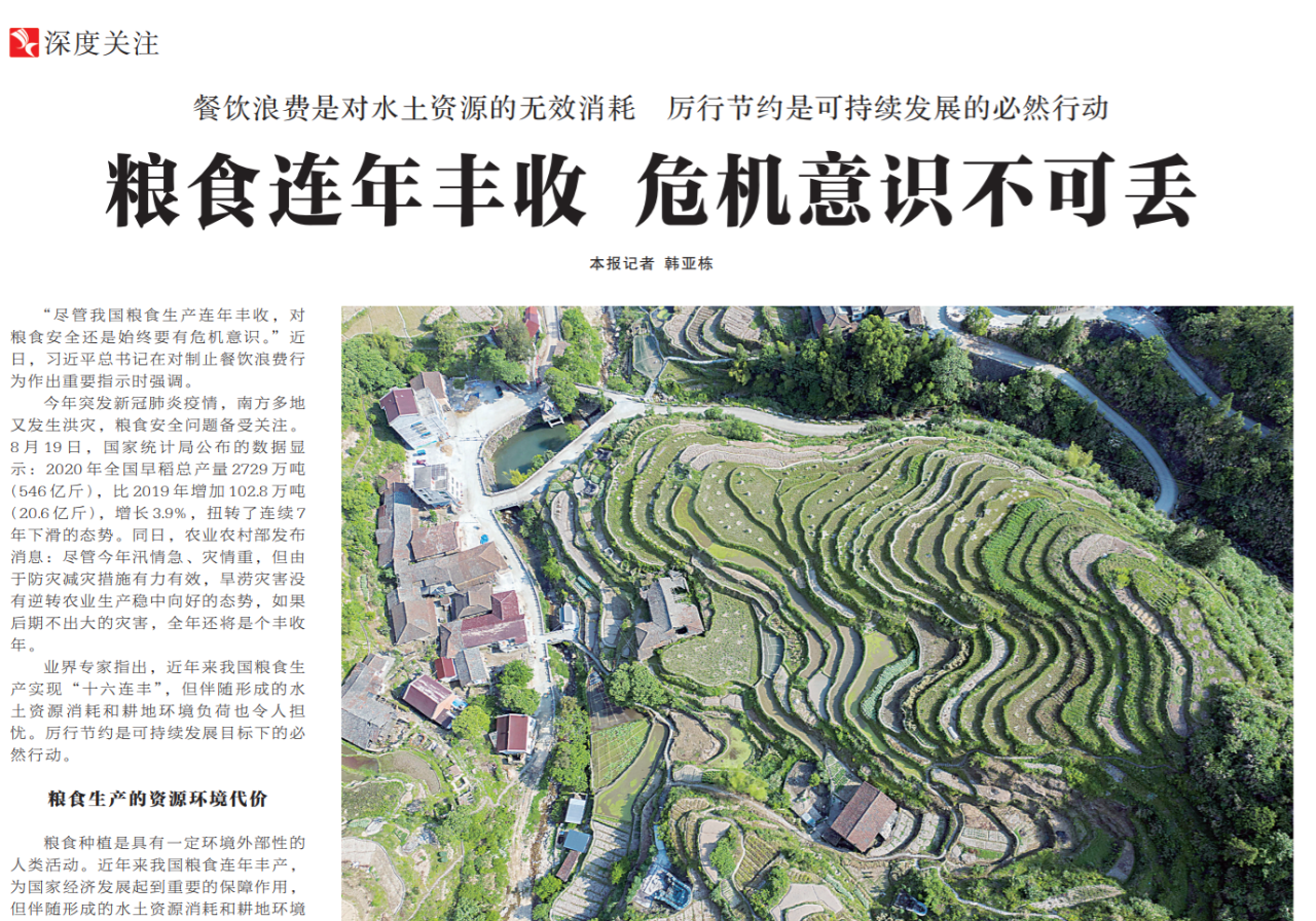 ●今天出版的中国纪检监察报深度关注专栏发布报道《粮食连年丰收 危机意识不可丢》。文章指出:近年来我国粮食生产实现“十六连丰”,但伴随形成的水土资源消耗和耕地环境负荷也令人担忧。厉行节约是可持续发展目标下的必然行动。