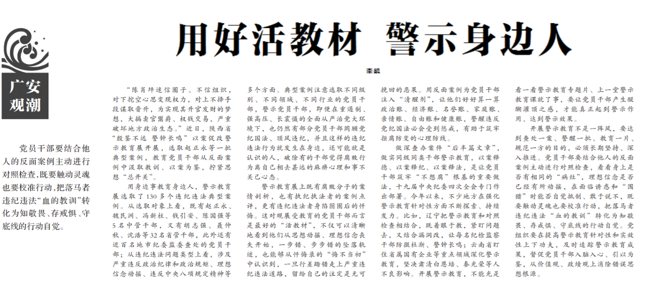 ●今天出版的中国纪检监察报广安观潮专栏发表评论《用好活教材 警示身边人》,以陕西省“殷鉴不远 警钟长鸣”以案促改警示教育展为例指出:开展警示教育不是一阵风,党组织要在提高警示教育针对性和实效性上下功夫,及时追踪警示教育成果,督促党员干部入脑入心、引以为鉴,从价值观、政绩观上消除错误思想根源。