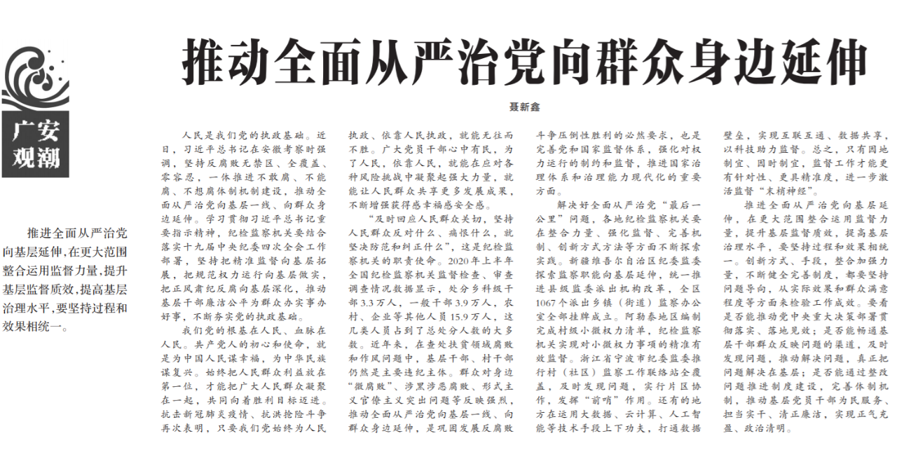 ●今天出版的中国纪检监察报广安观潮专栏发表评论《推动全面从严治党向群众身边延伸》。评论指出,近日,习近平总书记在安徽考察时强调,坚持反腐败无禁区、全覆盖、零容忍,一体推进不敢腐、不能腐、不想腐体制机制建设,推动全面从严治党向基层一线、向群众身边延伸。学习贯彻习近平总书记重要指示精神,纪检监察机关要结合落实十九届中央纪委四次全会工作部署,坚持把精准监督向基层拓展,把规范权力运行向基层做实,把正风肃纪反腐向基层深化,推动基层干部廉洁公平为群众办实事办好事,不断夯实党的执政基础。
