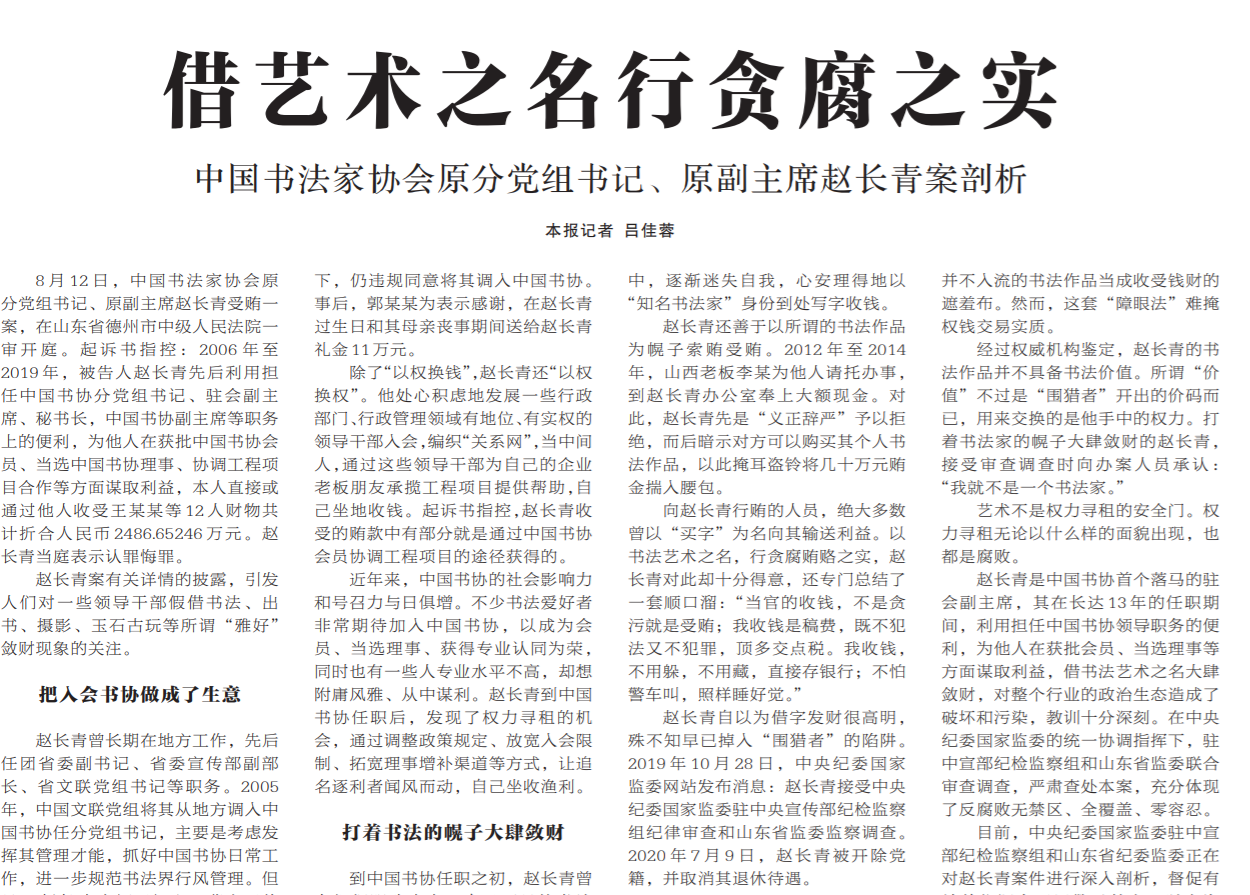 ●今天出版的中国纪检监察报以《借艺术之名行贪腐之实》为题,剖析中国书法家协会原分党组书记、原副主席赵长青案。赵长青把入会书协做成了生意,打着书法的幌子大肆敛财,其被控受贿2486万余元。文章指出,赵长青案有关详情的披露,引发人们对一些领导干部假借书法、出书、摄影、玉石古玩等所谓“雅好”敛财现象的关注。