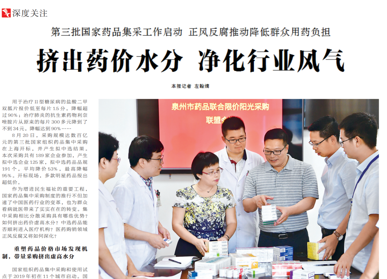 ●今天出版的中国纪检监察报深度关注专栏以《挤出药价水分 净化行业风气》为题,报道了第三批国家药品集采工作启动,正风反腐推动降低群众用药负担的情况。文章指出,药品集中采购模式从根本上改善了医药行业生态环境,有利于医药产业从营销驱动向创新驱动转变,但在实施过程中仍然面临着企业违约、医院不配合、权力滥用等诸多不确定因素,需要进一步完善机制、强化监管。