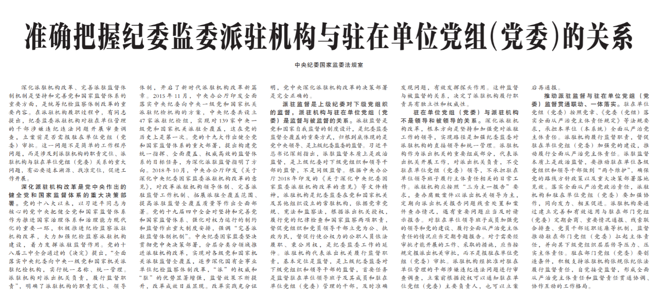 ●今天出版的中国纪检监察报刊发中央纪委国家监委法规室的文章《准确把握纪委监委派驻机构与驻在单位党组(党委)的关系》。文章指出:派驻监督是上级纪委对下级党组织的监督,派驻机构与驻在单位党组(党委)是监督与被监督的关系。驻在单位党组(党委)与派驻机构不是领导和被领导的关系,必须推动派驻监督与驻在单位党组(党委)监督贯通联动、一体落实。