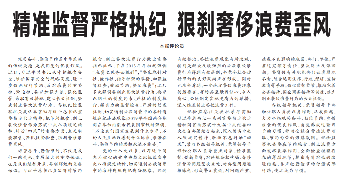 ●今天出版的中国纪检监察报发表评论员文章《精准监督严格执纪 狠刹奢侈浪费歪风》。文章指出:各级纪检监察机关要认真贯彻习近平总书记重要指示批示精神,把节约粮食、制止餐饮浪费作为落实中央八项规定精神、纠治“四风”的重要方面,立足职能职责、强化监督检查,狠刹奢侈浪费歪风。