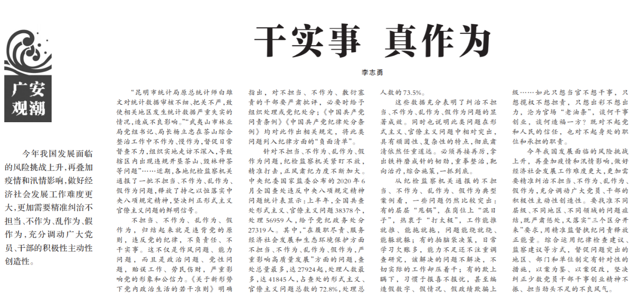●今天出版的中国纪检监察报广安观潮专栏发表评论《干实事 真作为》。文章指出:今年我国发展面临的风险挑战上升,再叠加疫情和汛情影响,做好经济社会发展工作难度更大,更加需要精准纠治不担当、不作为、乱作为、假作为,充分调动广大党员、干部的积极性主动性创造性。