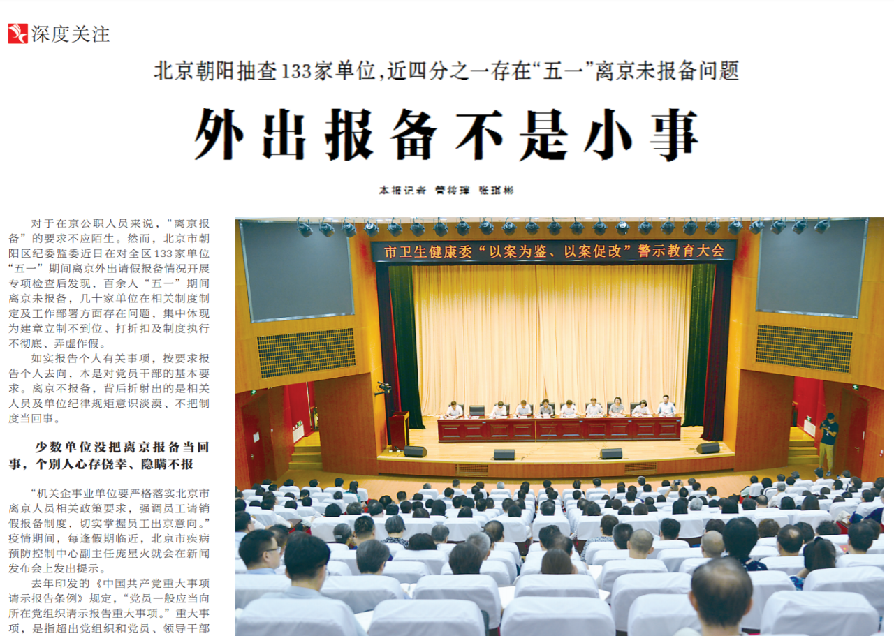 ●今天出版的中国纪检监察报深度关注专栏以北京朝阳抽查133家单位,近四分之一存在“五一”离京未报备问题为例指出,如实报告个人有关事项,按要求报告个人去向,本是对党员干部的基本要求。离京不报备,背后折射出的是相关人员及单位纪律规矩意识淡漠、不把制度当回事。