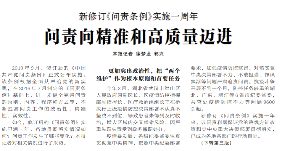 ●今天出版的中国纪检监察报头版以《问责向精准和高质量迈进》为题,报道了修订后的《中国共产党问责条例》正式公布实施一周年之后,各地的贯彻落实情况。文章指出,必须坚持从严问责和精准问责两手抓。查明党组织、党的领导干部失职失责问题,要综合考虑主客观因素,区别不同情况,精准作出问责决定。