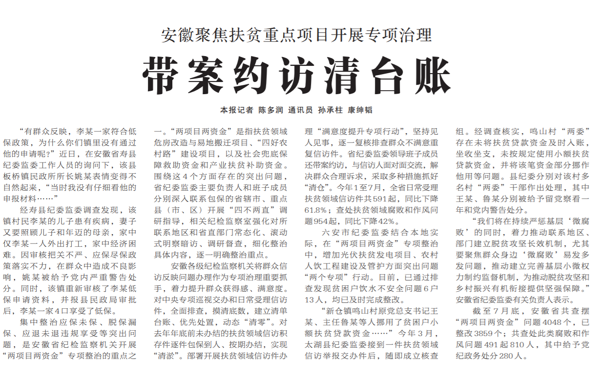 ●今天出版的中国纪检监察报以《带案约访清台账》为题,报道了安徽各级纪检监察机关聚焦扶贫重点项目,开展“两项目两资金”专项整治的情况。截至7月底,安徽省共查摆“两项目两资金”问题4048个,已整改3859个;共查处此类腐败和作风问题491起810人,其中给予党纪政务处分280人。