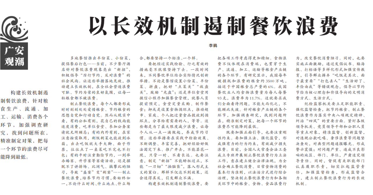 ●今天出版的中国纪检监察报《广安观潮》专栏发表评论《以长效机制遏制餐饮浪费》,文章指出:纪检监察机关要立足职能职责、强化监督检查,把节约粮食、制止餐饮浪费作为落实中央八项规定精神、纠治“四风”的重要方面;同时督促有关职能部门认真履职尽责,切实扛起监管责任,加强监督检查,形成监督合力,建立制止餐饮浪费行为的长效机制。