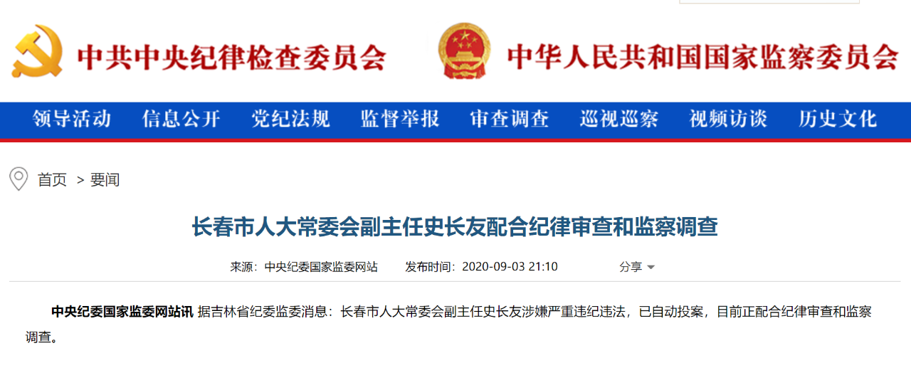●中央纪委国家监委网站3日发布通报:长春市人大常委会副主任史长友涉嫌严重违纪违法,已自动投案,目前正配合纪律审查和监察调查。