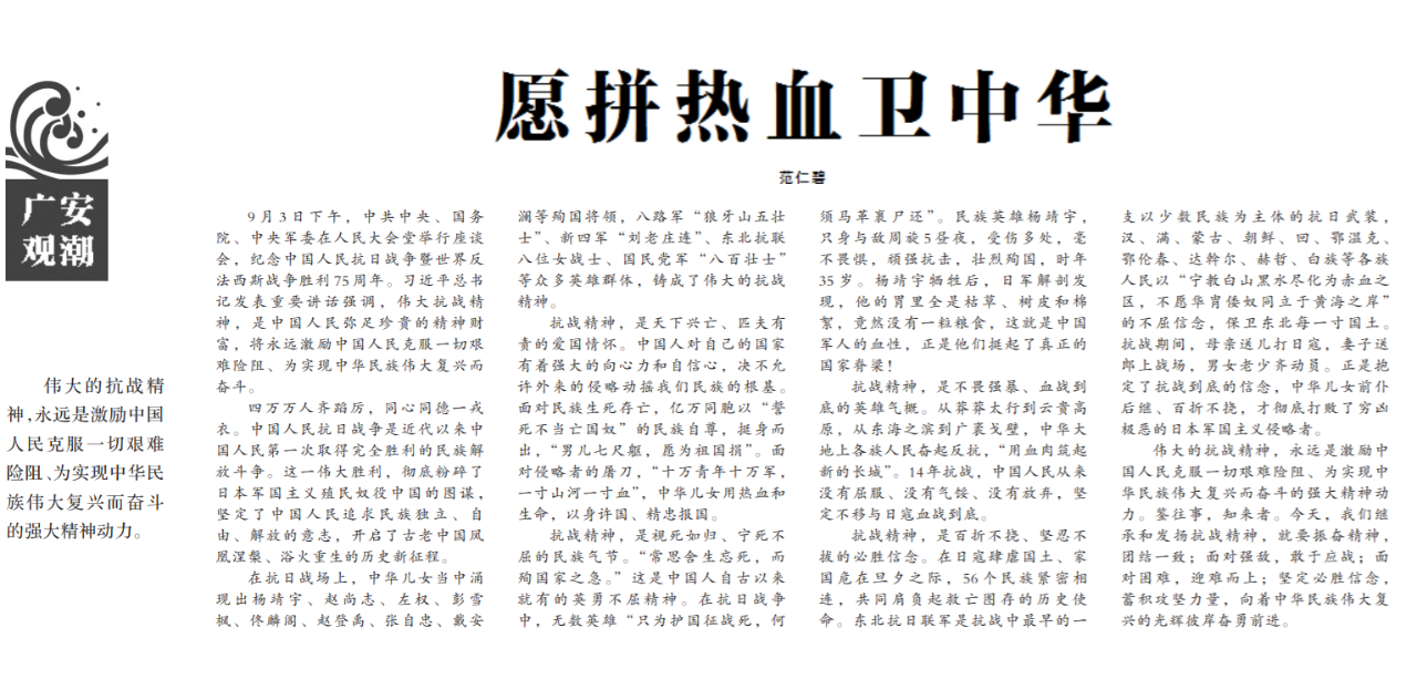 ●今天出版的中国纪检监察报广安观潮专栏发表评论《愿拼热血卫中华》指出:伟大的抗战精神,永远是激励中国人民克服一切艰难险阻、为实现中华民族伟大复兴而奋斗的强大精神动力。