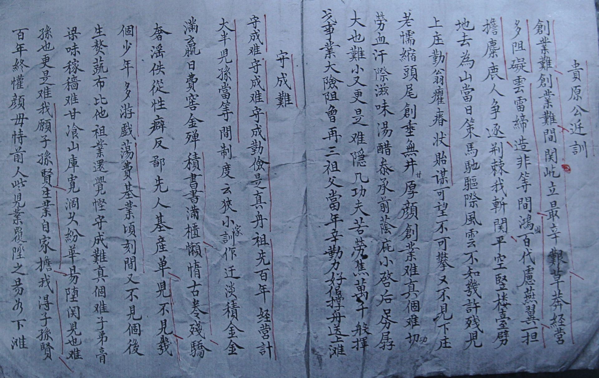 再次,庭训主人贵原公的思想深度确实不同一般。他高屋建瓴地告诫子孙,创业中要牢记“草莽经营多阻碍”,这是创业的最大难处,也是创业者的忌讳。谆谆教导子孙“鸿图百代虑,燕翼一担担”,语重心长,意境高远。庭训还一针见血地指出:“祖先百年经营计,大半见孙当等闲。”可见,这是个积重难返的社会问题,即便到了二十一世纪的今天,这也是个不容忽视的问题。我们今天一再强调“不忘初心”,继承“红色基因”,也正是这个原因。