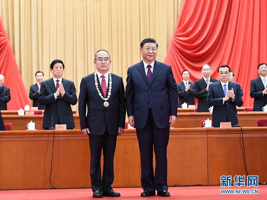 栗战书宣读习近平签署的中华人民共和国主席令。主席令指出,为了隆重表彰在抗击新冠肺炎疫情斗争中作出杰出贡献的功勋模范人物,弘扬他们忠诚、担当、奉献的崇高品质,根据第十三届全国人民代表大会常务委员会第二十一次会议的决定,授予钟南山“共和国勋章”,授予张伯礼、张定宇、陈薇“人民英雄”国家荣誉称号。