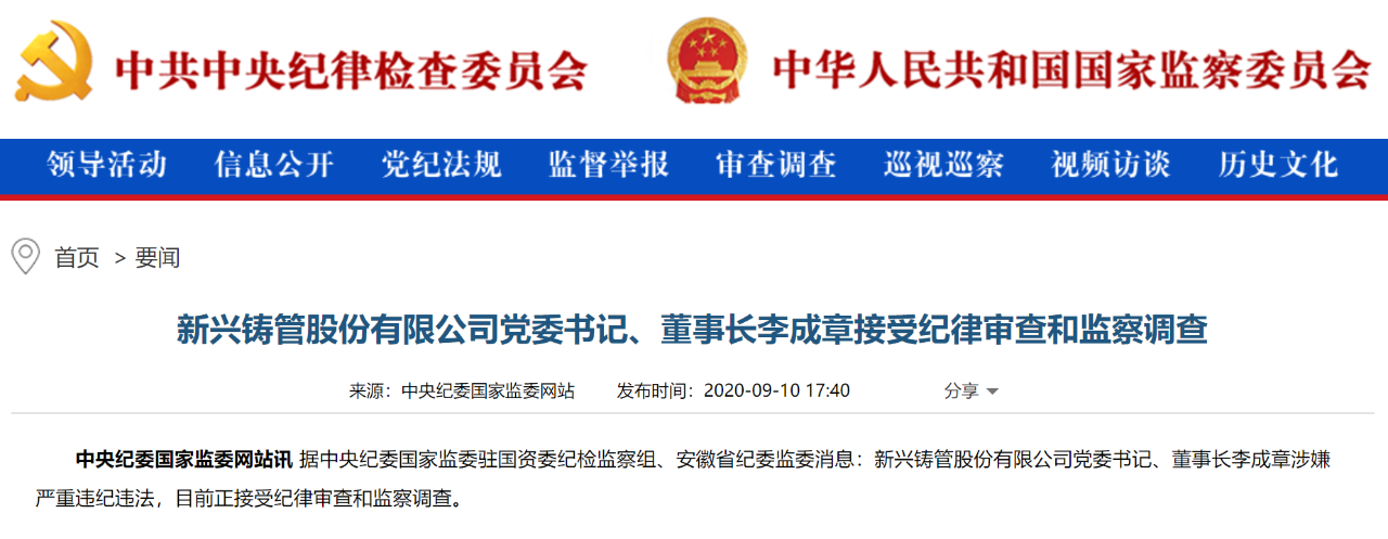 ●中央纪委国家监委网站10日发布通报:据中央纪委国家监委驻国资委纪检监察组、安徽省纪委监委消息:新兴铸管股份有限公司党委书记、董事长李成章涉嫌严重违纪违法,目前正接受纪律审查和监察调查。