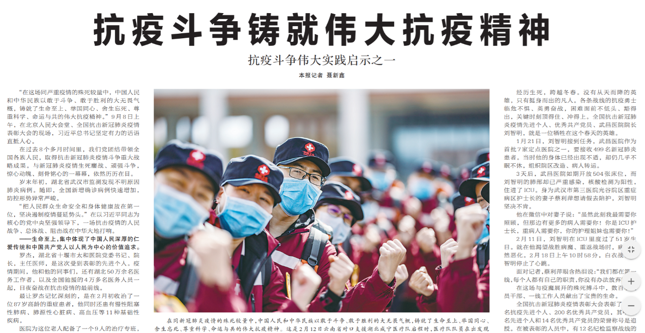 ●今天出版的中国纪检监察报头版头条发布报道《抗疫斗争铸就伟大抗疫精神》指出:在艰苦卓绝的抗疫斗争中,中华儿女铸就了伟大抗疫精神,同中华民族长期形成的特质禀赋和优秀传统文化基因一脉相承,是爱国主义、集体主义、社会主义精神的传承和发展。